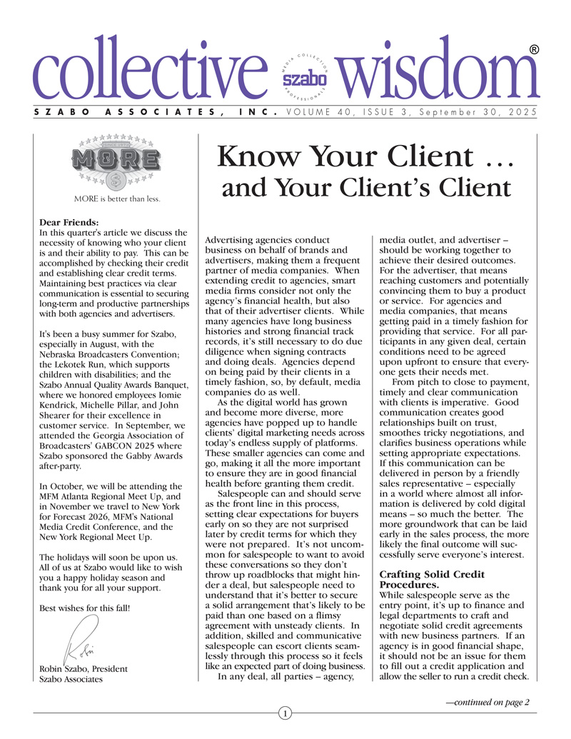 For more than 30 years, credit and collection managers in all media have looked to Collective Wisdom as a timely and valuable source of information on industry trends, legal issues, as well as credit and collection.
